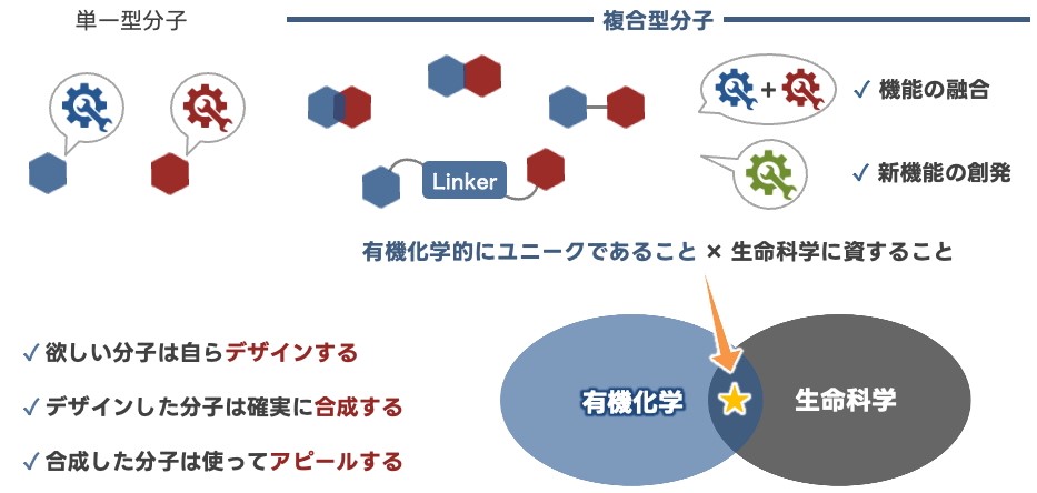 生命有機分子化学研究室では,有機化学の視点から生命現象を分子レベルで捉え,その理解と制御の手がかりを得ることを目指しています。私たちは「自ら分子をデザインし,確実に合成し,それを活用して新たな価値を見出す」ことを基本姿勢とし,生命科学に資するユニークな分子の創成に取り組んでいます。特に,複数の機能性ユニットを有機的に組み合わせた「複合型分子」の設計と応用を研究の核としています。当研究室が志向する複合型分子とは,単一の分子構造内に戦略的に組み込んだ機能性ユニットを互いに協調させることで,単なる「足し算」に留まらない新たな性質や機能を創発させる分子です。具体的には,天然物,人工機能分子,蛍光色素,反応剤,阻害剤などをベースに生命科学に資する分子の開発を進めています。研究テーマは多岐にわたり,ひずみ分子やラジカル種といった高反応性化学種を駆使した分子修飾法の開発,多剤耐性に関与する膜タンパク質(特にABCトランスポーター)の阻害剤設計,細胞内で機能する近赤外発光分子や円偏光発光(CPL)を示すキラル発光分子の創製などが挙げられます。